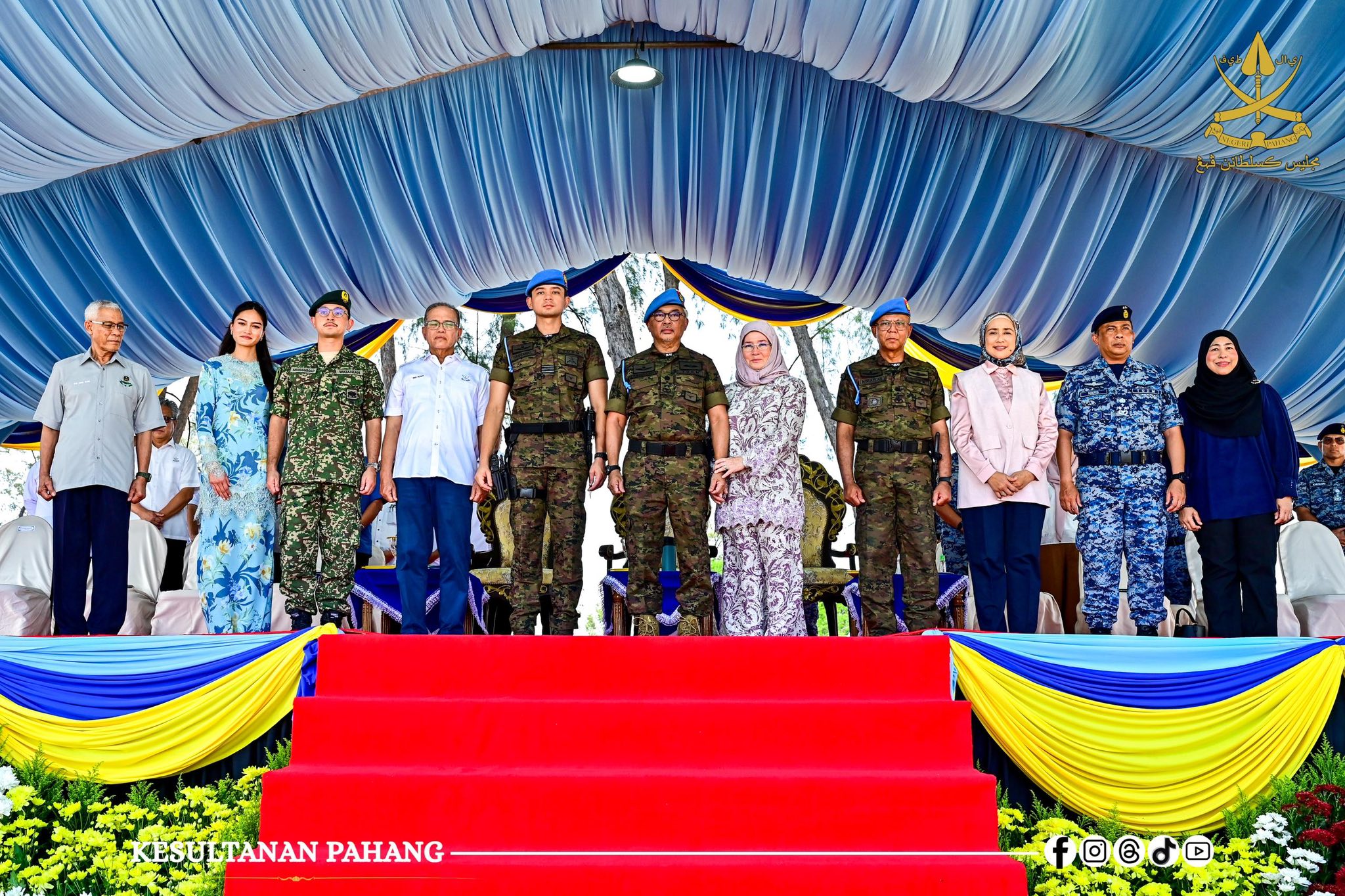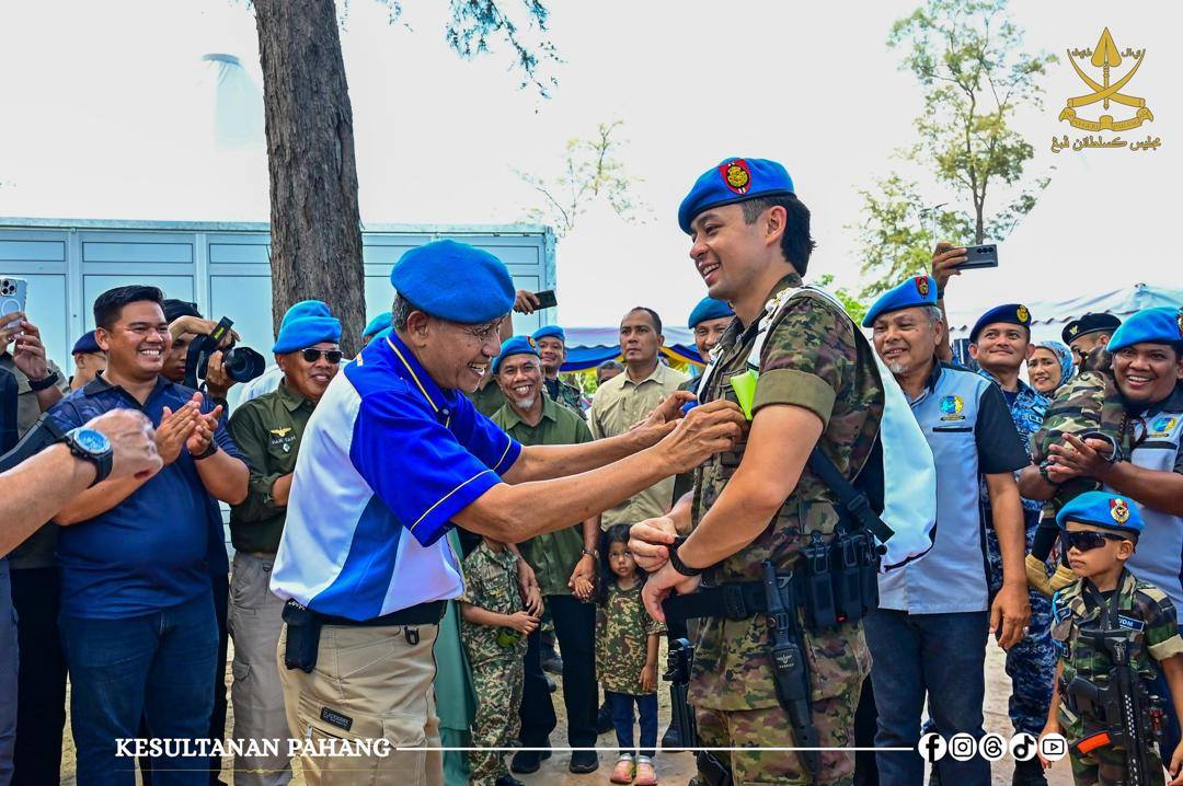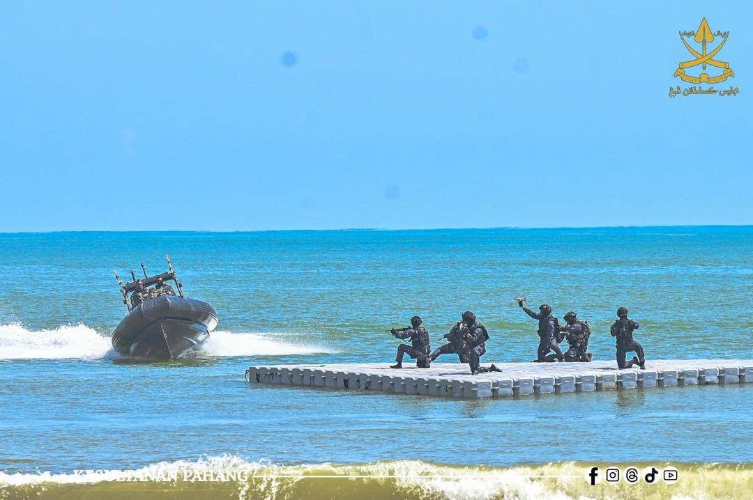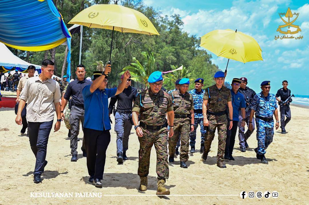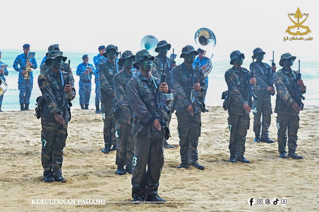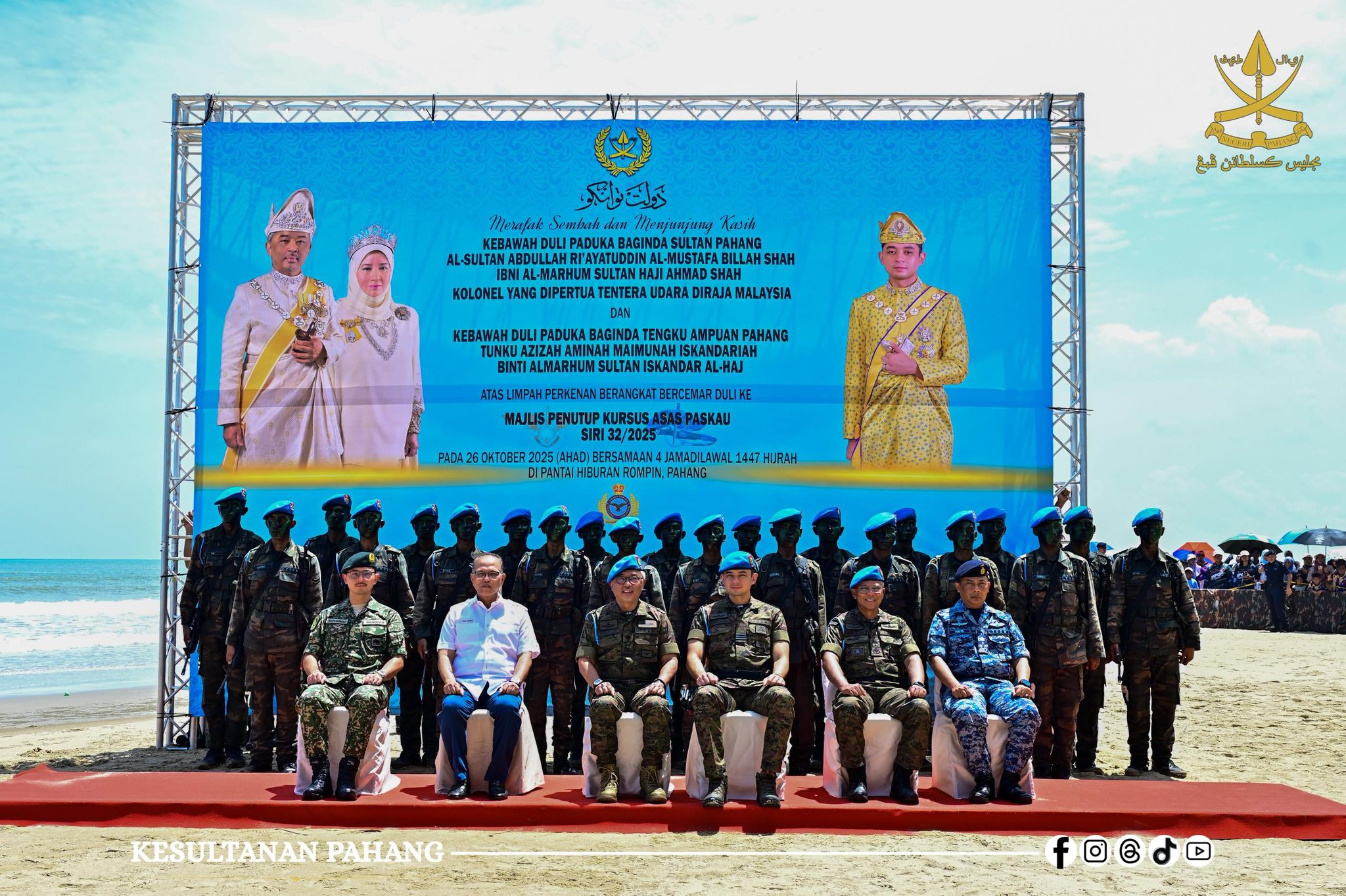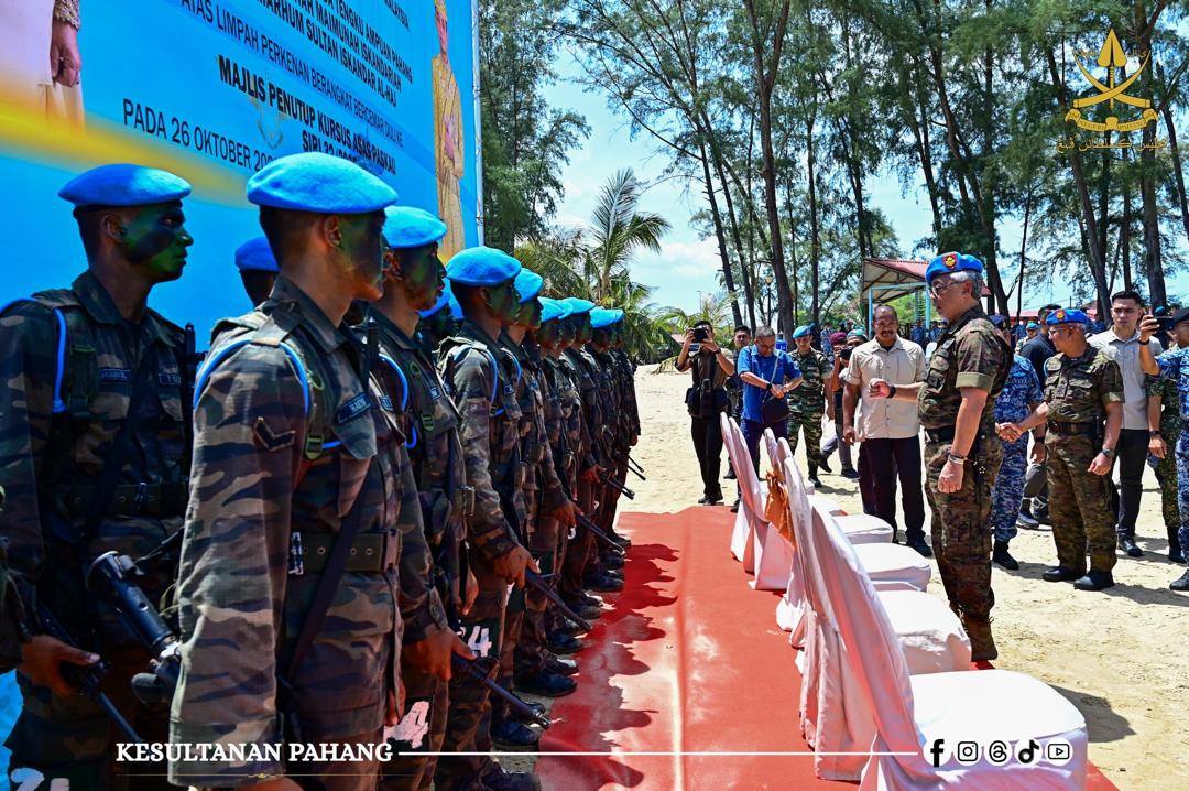 ROMPIN, 26 Oktober 2025 -Kebawah Duli Paduka Baginda Sultan Pahang Al-Sultan Abdullah Ri’ayatuddin Al-Mustafa Billah Shah Ibni Almarhum Sultan Haji Ahmad Shah Al-Musta’in Billah dan Kebawah Duli Paduka Baginda Tengku Ampuan Pahang Tunku Azizah Aminah Maimunah Iskandariah binti Almarhum Sultan Iskandar Al-Haj berkenan bercemar duli berangkat menyempurnakan Majlis Penutup Kursus Asas Pasukan Khas TUDM (PASKAU) Siri 32/25 di Pantai Hiburan, hari ini.