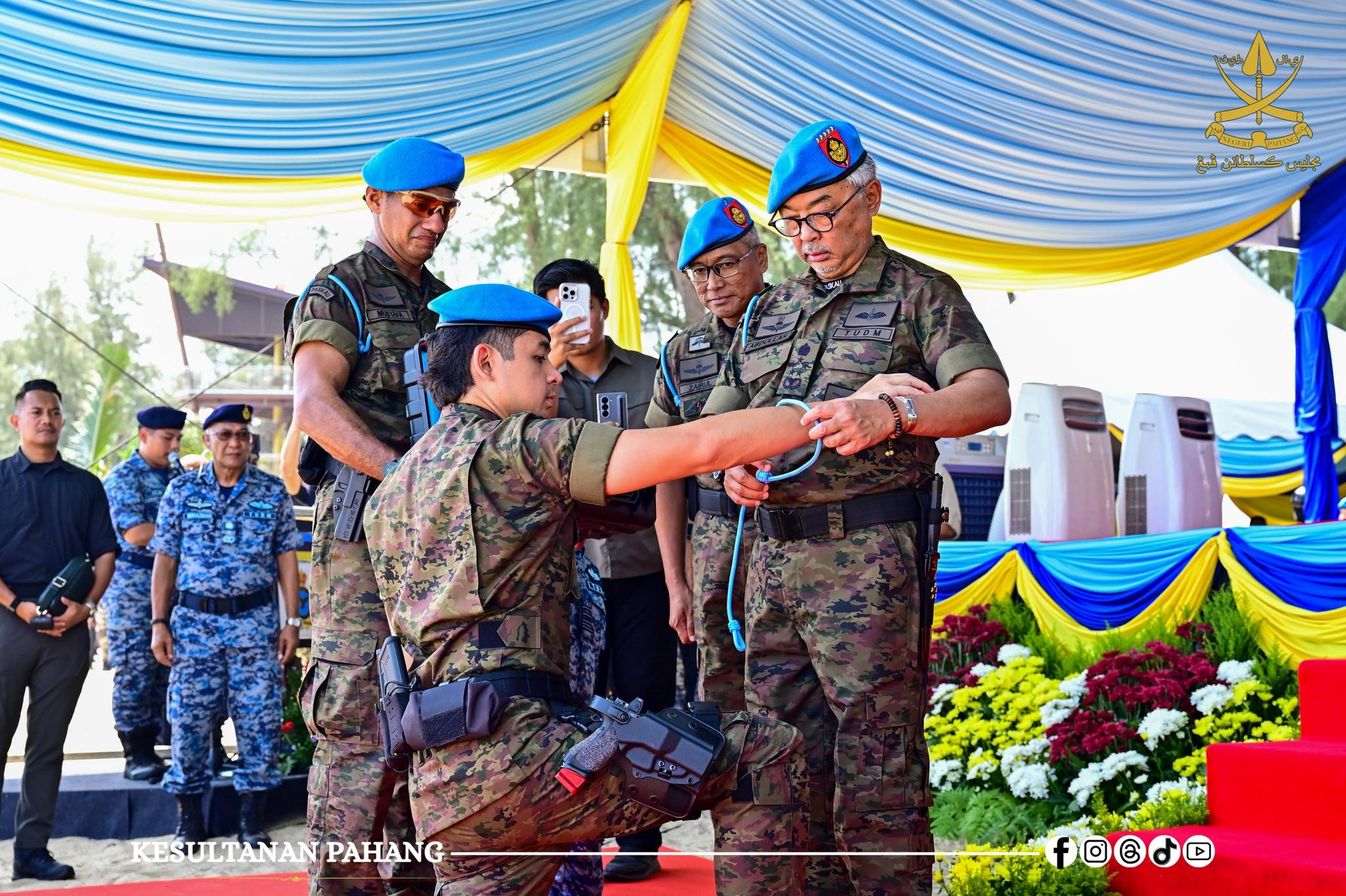 Paduka Baginda turut mengurniakan Beret Biru PASKAU, Lanyard Biru dan Dagger PASKAU kepada KDPM Tengku Mahkota Pahang dan Panglima Tentera Udara, Jeneral Dato’ Sri Haji Muhamad Norazlan bin Aris TUDM yang turut berjaya menamatkan latihan sama.